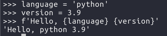 변수에 값을 넣고 { } 에 변수 이름을 지정하고 문자열 앞에 f를 붙이면 변수의 값을 { }에 불러올 수 있다.