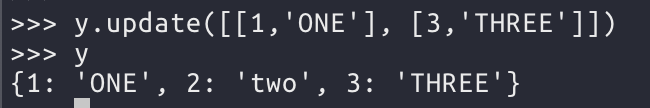 update(키=값)은 키가 문자열일 때만 사용할 수 있다. 키가 숫자일 경우 update()괄호 안에 딕셔너리를 넣어서 수정할 수 있다.