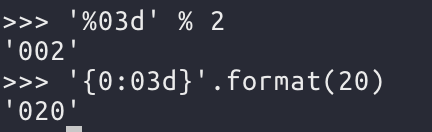 정수와 실수 앞에 0을 넣어서 숫자 개수를 맞출 수 있다. %d는 %와 d사이에 0과 숫자 자리수를 넣으면 자리수에 맞춰서 앞에 0이 들어간다. { }를 사용할 때는 인덱스나 이름 뒤에 클론을 붙이고, 03d처럼 0과 숫자 개수를 지정해주면 된다.