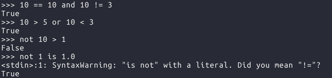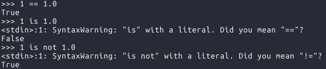 1과 1.0은 값은 같지만 객체는 정수와 실수로 다르기 때문에 ==에서는 True가 나왔고, is 에서는 false가 나왔다. 또한 다음을 보면 is와 is not는 객체 뿐 아니라 값도 함께 일치해야 참을 반환한다는 것도 알 수 있다.