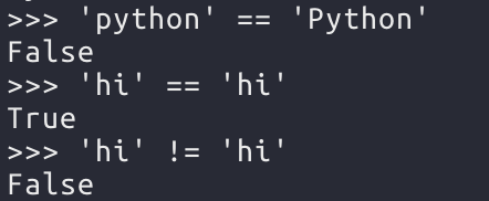 숫자와 동일하게 문자열도 ==, !=로 비교 가능하다. 문자열은 대소문자를 구분하여 같은 단어라도 대소문자가 다르면 다르다고 판단한다.