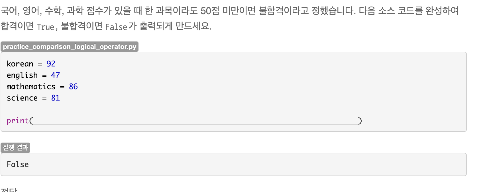 and 연산의 경우 연산하는 모든 값이 True여야 True를 반환하기 때문에 한 과목이라도 50점 미만인 과목이 있으면 False를 반환한다.