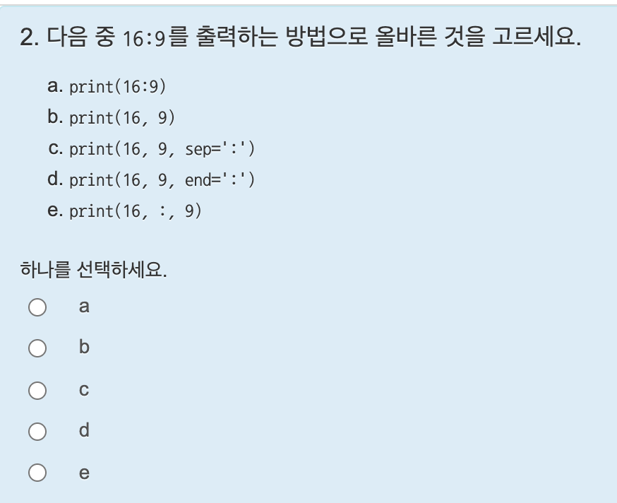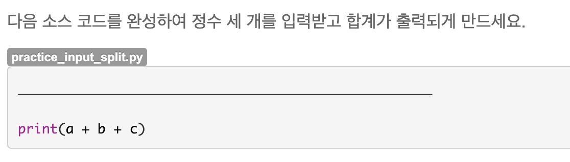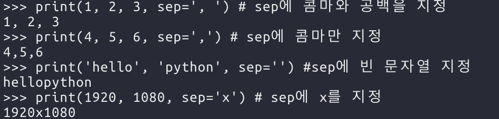 sep는 구분자 라는 뜻의 separator에서 따온 것이다. 다음과 같이 print의 sep에 문자 또는 문자열을 지정해 주면 된다.
