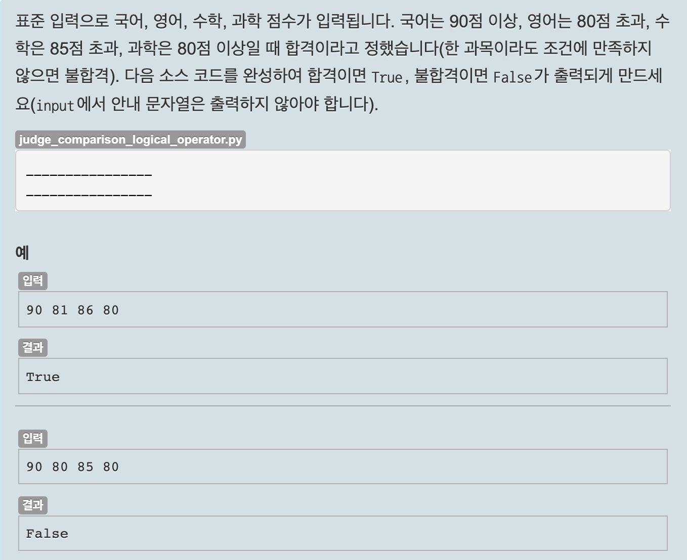 변수가 여러개 필요하기 때문에 map()과 split()으로 여러 변수에 값을 저장한 후 한 과목이라도 조건에 만족하지 않으면 False가 출력되야 하므로 and 논리 연산을 이용하였다.