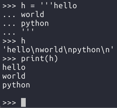 다음과 같이 작은따옴표 세 개(''' ''') 또는 큰 따옴표 세 개(""" """)를 사용하면 여러줄 문자열을 출력하거나 변수에 저장할 수 있다.