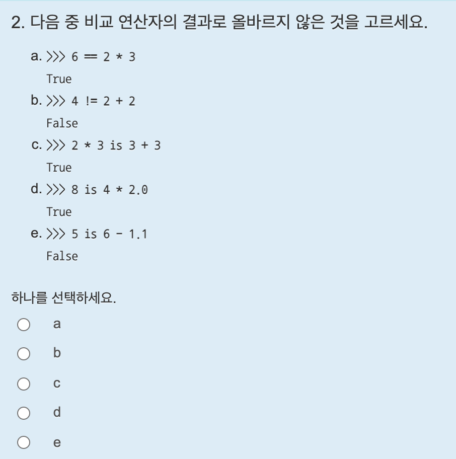 두 숫자가 같은지 비교할때는 ==(equal), 다른지 비교할 때는 !=(not equal)을 사용한다.