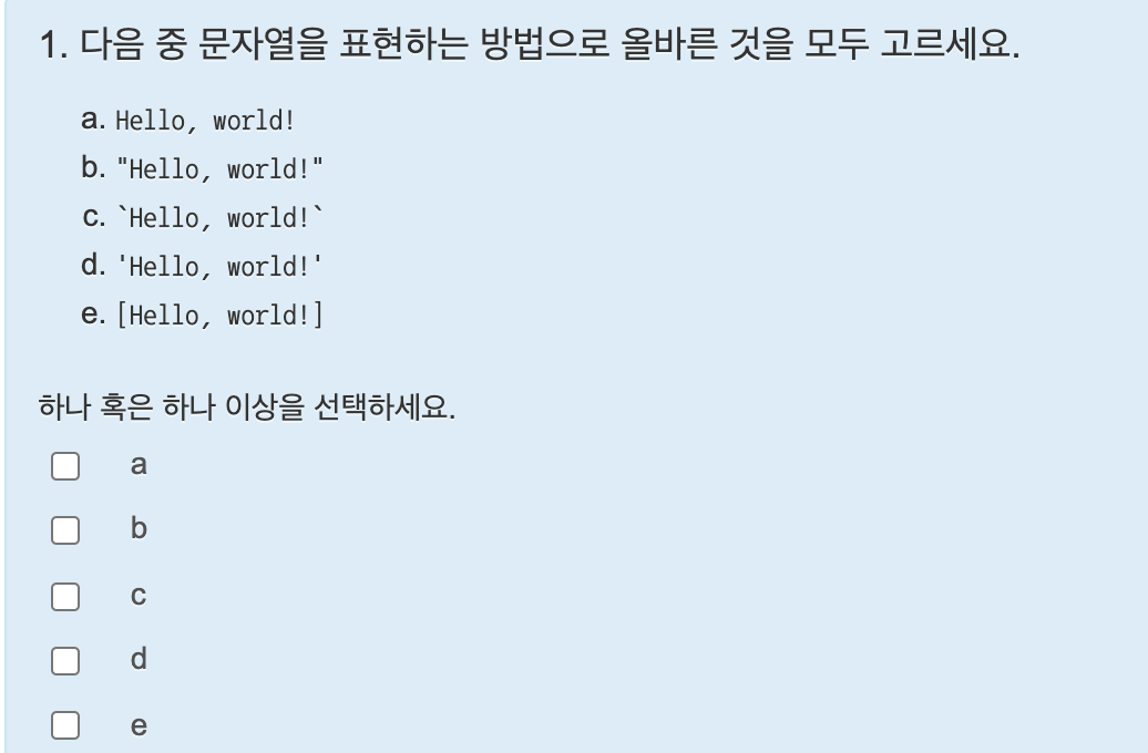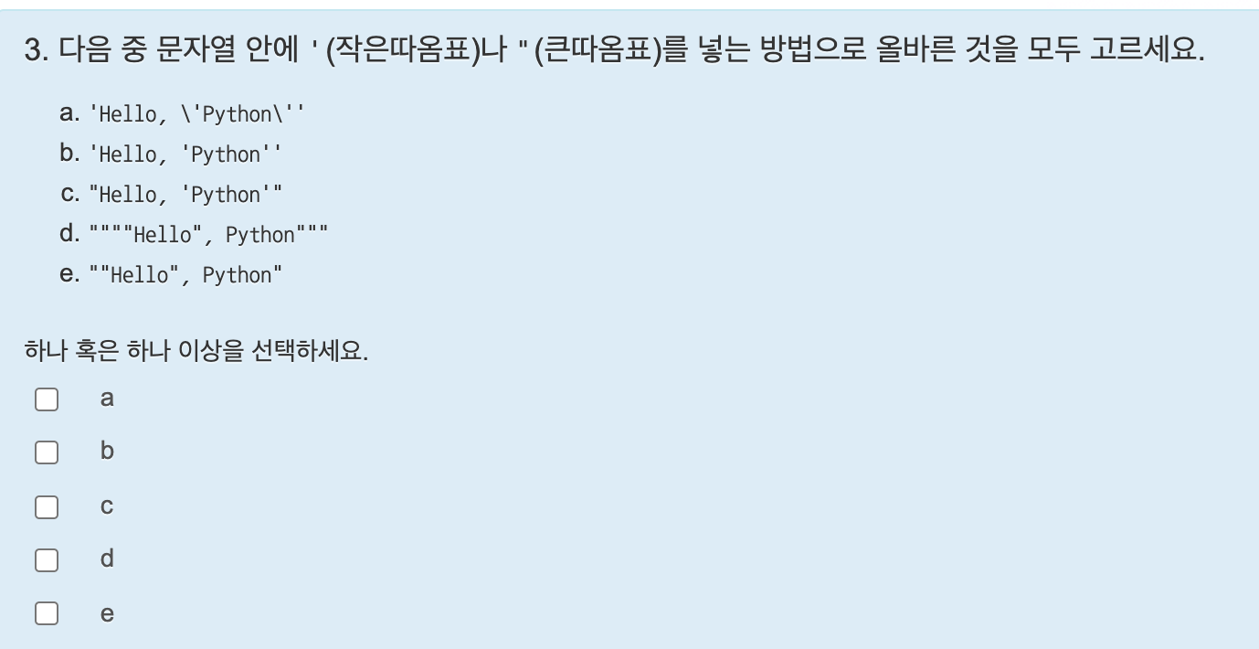 문자열을 사용하다 보면 작은 따옴표나 큰 따옴표를 사용해야 할 경우가 있다. 문자열 안에 작은 따옴표를 넣고 싶으면 큰 따옴표를 사용해 문자열을 만들고, 큰 따옴표를 넣고 싶다면 작은 따옴표를 사용해 문자열을 만들면 된다.