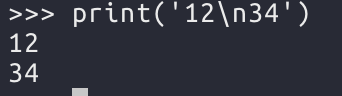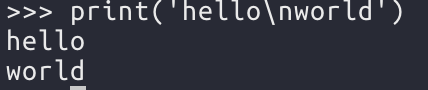 값들 사이에 줄바꿈을 의미하는 \n이 들어가서 여러줄로 출력된 것이다. \n은 제어문자이기 때문에 화면에 출력되지는 않는다. \n도 문자이기 때문에 다음과 같이 print에 바로 넣어서 사용할 수 도 있다.
