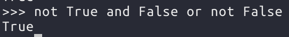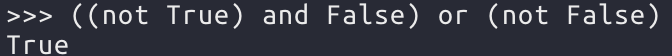 위와 같이 여러개의 논리 연산자가 사용됬을 경우 연산 우선 순위는 not, and, or순서이다. 따라서 위 코드는 False and Fase or True 가 되고, False or True 가 되서 결과적으로 True가 나온다. 괄호로 묶어서 보면 다음과 같다.