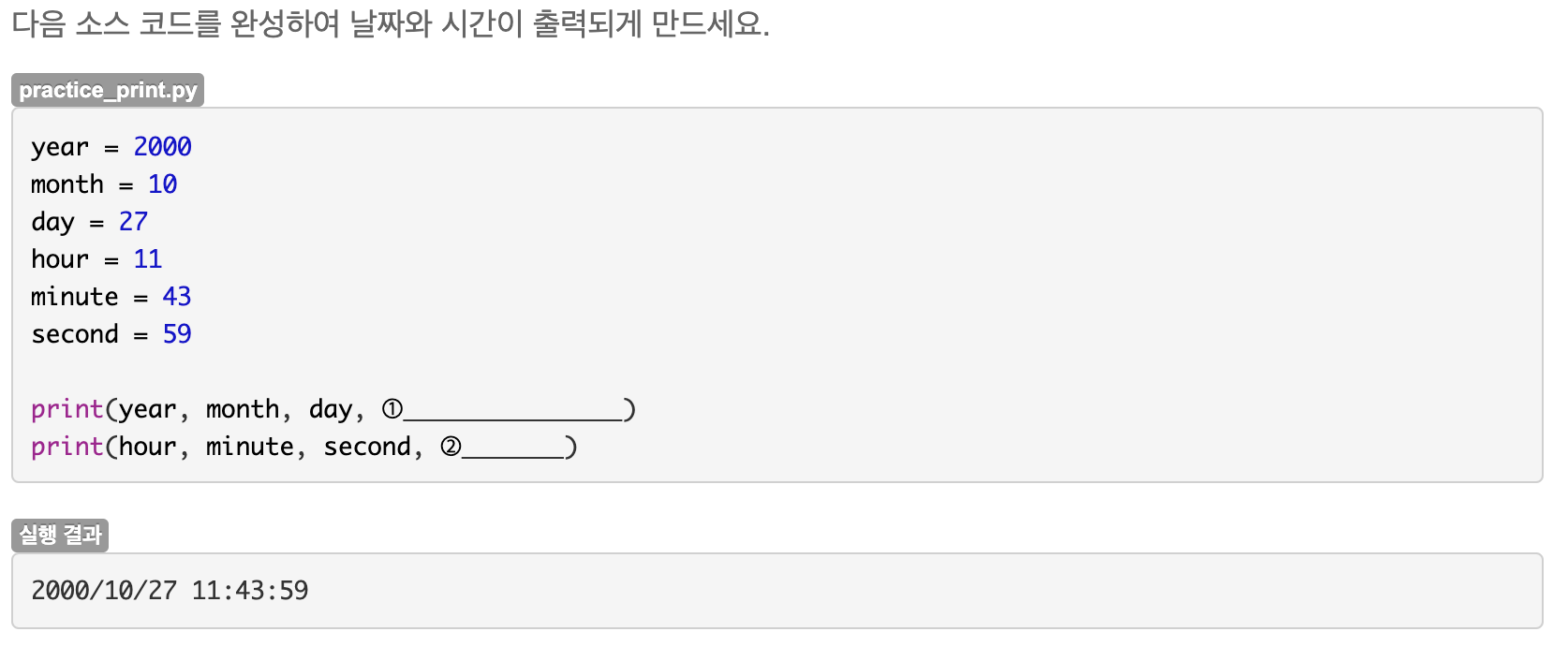 출력 결과가 한줄이고, 두 print사이에 공백이 있으므로 첫번째 print에는 end에 공백 한 칸이 들어가야 한다.