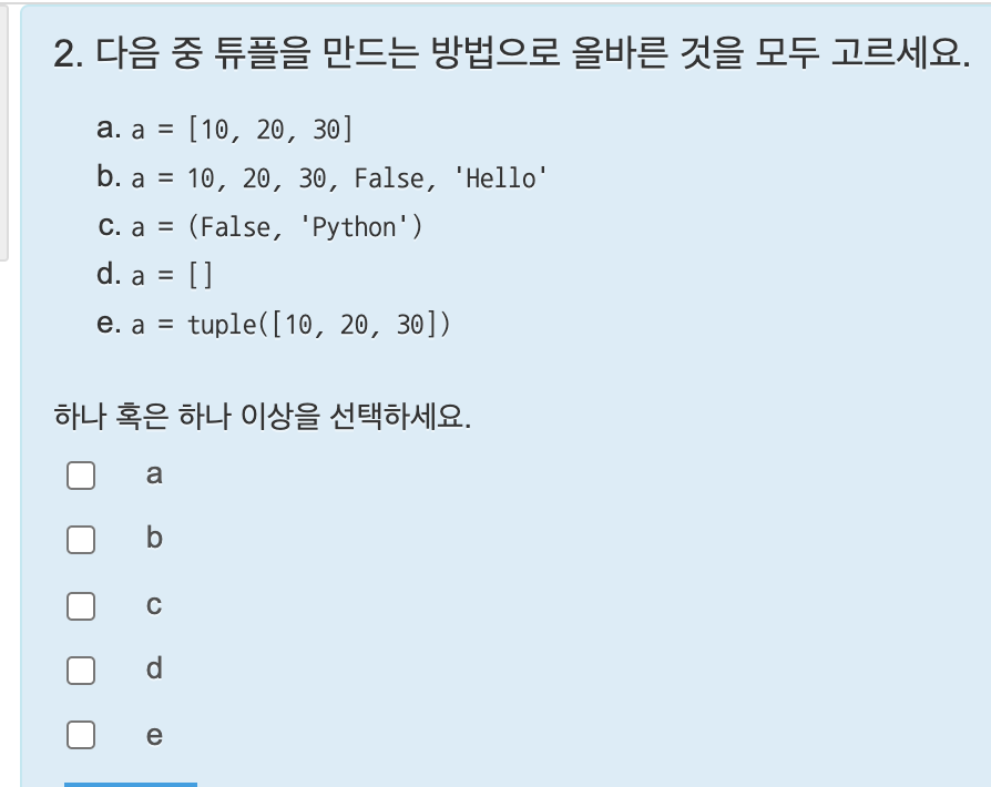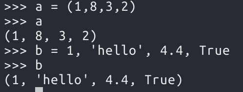 변수에 값을 저장할 때 ( )괄호로 묶으면 튜플이 되며 각 요소들은 ,(콤마)로 구분한다. 괄호로 묶지 않고 콤마로 구분만 해도 튜플이 된다.