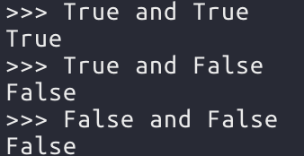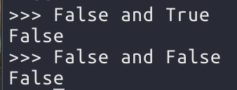 and 연산자는 비교하는 두 값이 모두 True 여야 True 이다. 하나라도 False가 있으면 False가 나온다.