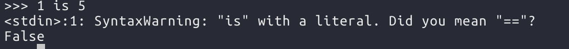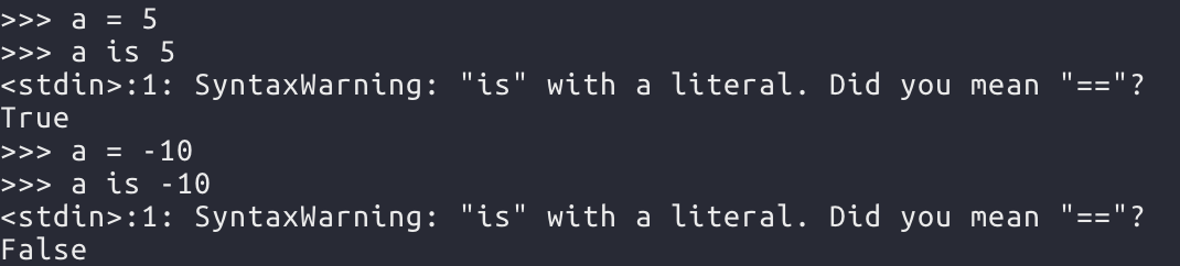 값 비교에는 is 를 사용하면 안된다. 아래와 같이 값이 한번 할당 됬던 상태에서 다른 값을 할당하면 메모리 주소가 달라질 수 있기 때문이다.