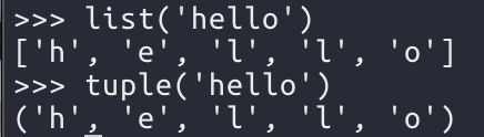 문자열을 리스트나 튜플에 넣으면 문자 하나 하나가 리스트나 튜플의 요소로 들어가게 된다.