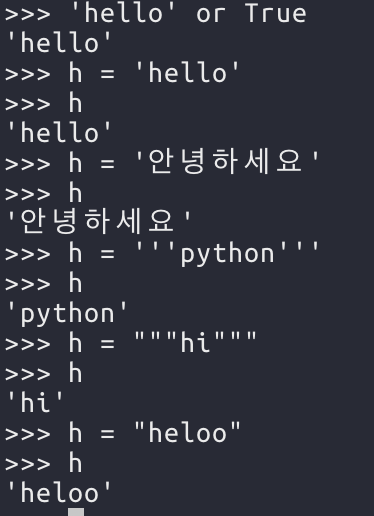 문자열은 영문 뿐 아니라 한글또한 가능하다. 또한 문자열을 만드는 법은 작은따옴표(' ') 이외에도 큰따옴표(" "), 작은따옴표 세 개로 묶는것(''' '''), 큰따옴표 3개로 묶는것(""" """)이 있다.