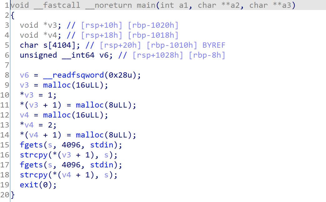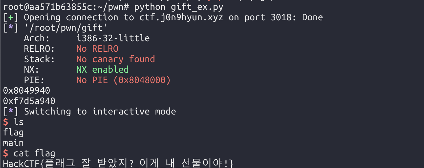 free를 하면 함수포인터를 저장하기 위한 공간인 8바이트와 사용자가 입력한 크기가 해제되기 때문에 add_note를 두 번 호출한 후 만들어진 두 공간을 모두 해제하고, 8바이트를 할당하면 함수 포인터가 저장된 공간에 사용자 입력값이 들어가므로 입력값으로 magic 함수의 주소를 넣어 해당 함수를 실행시킬수 있다.