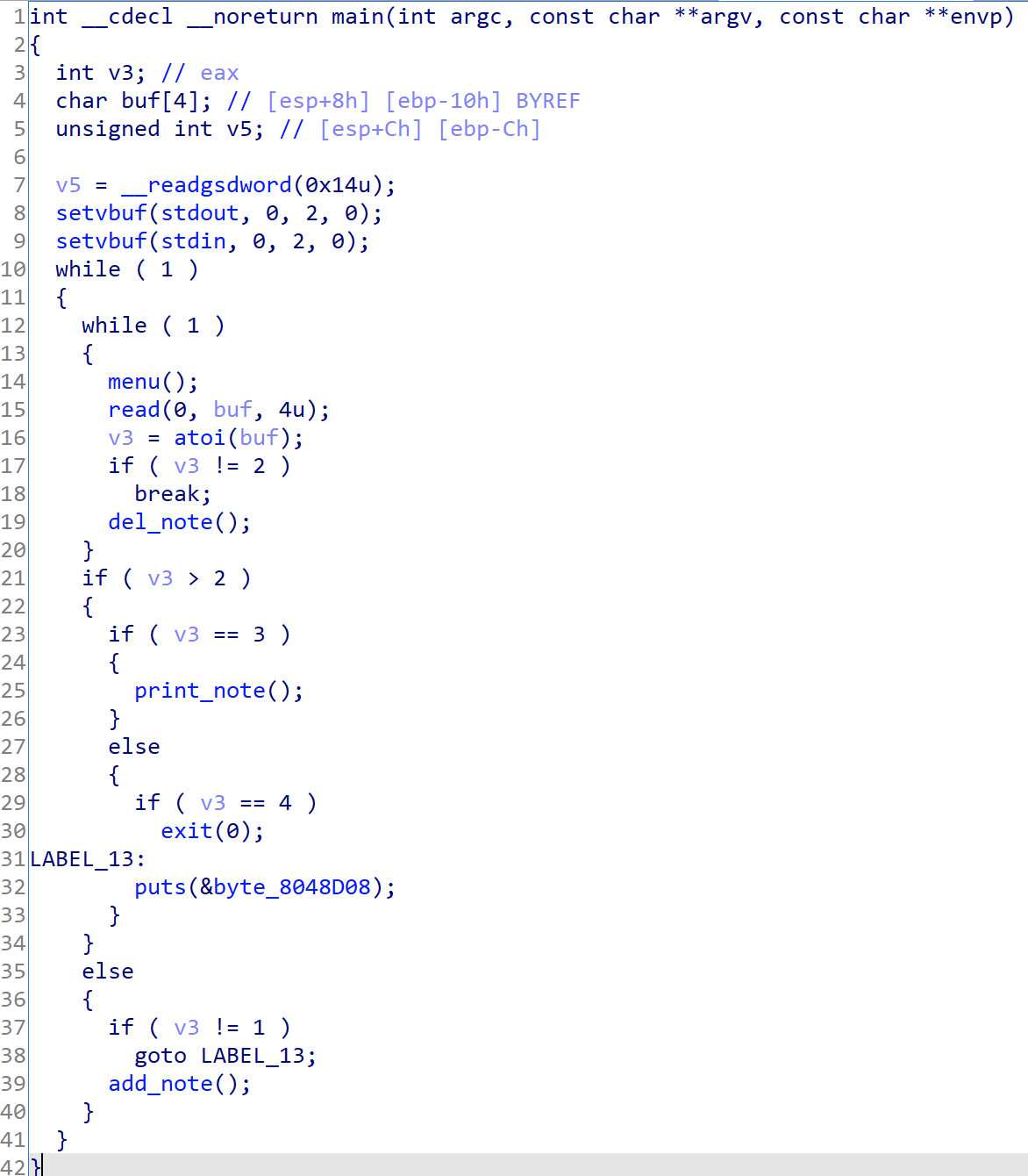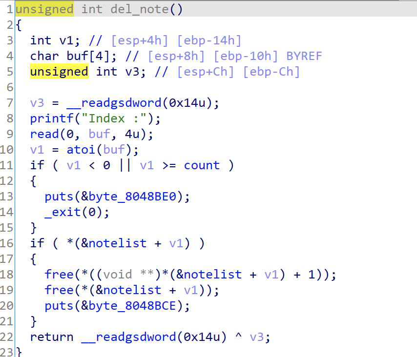 del_note함수에서 free를 한 후 할당했던 메모리 공간을 초기화하지 않아서 UAF 취약점이 발생한다.