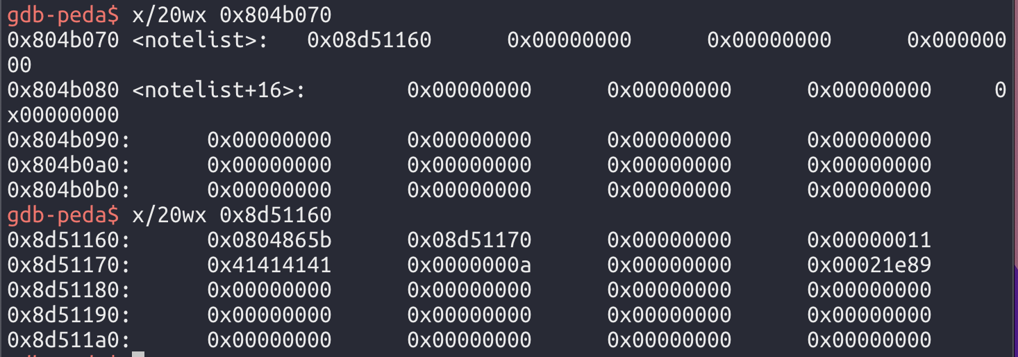 notelist 배열에 저장되어있는 주소값에 입력값이 저장된 주소를 갖고있고, 그 주소에 접근하면 입력된 값이 저장되어 있는 것을 확인할 수 있다. 그러나 free 이후에도 입력값을 저장하는 주소에 대한 값은 초기화되지 않는다.