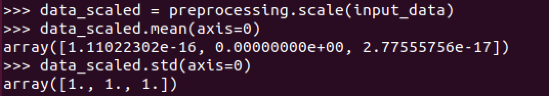 평균 제거는 preprocessing.scale() 함수로 할 수 있다.