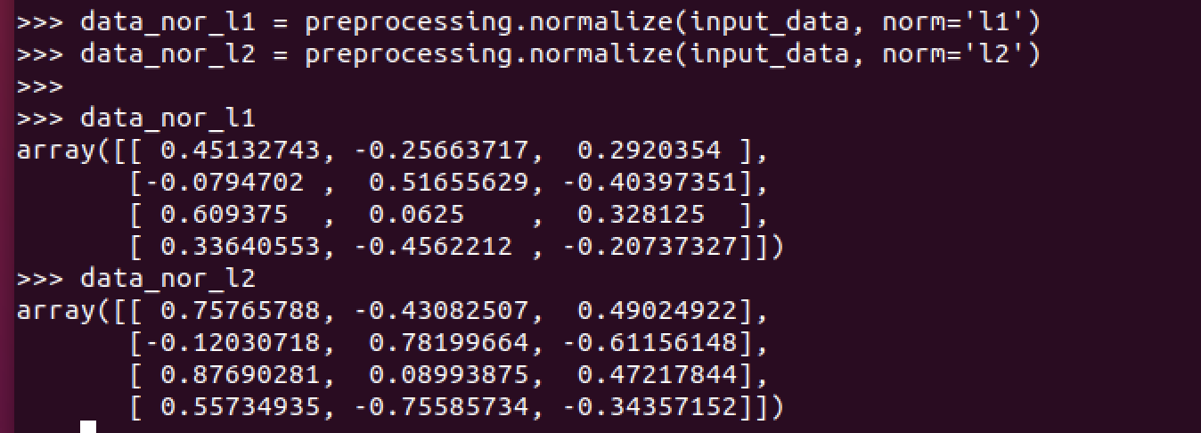 특징 벡터의 값을 일정한 기준으로 측정하기 위한 것이다. 대표적인 정규화 기법으로는 총 합이 1이 되도록 값을 조정하는 L1 정규화와 각 행의 절댓값의 합이 1이 되도록 조정하는 L2 정규화가 있다. L1 정규화 기법은 데이터의 이상치(아웃라이어)에 영향을 덜 받기 때문에 더 안정적이며 이상치가 문제 해결에 중요한 역할을 한다면 L2 정규화를 사용하는 것이 낫다.