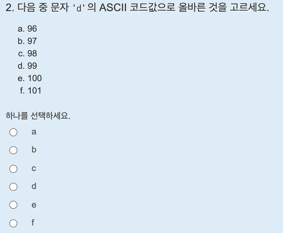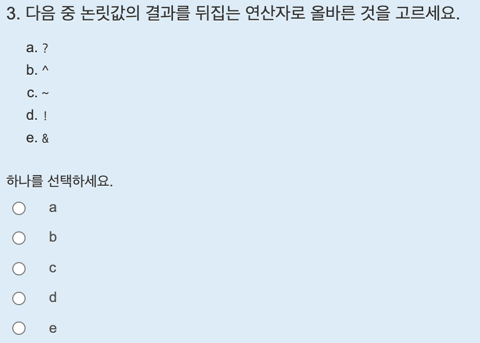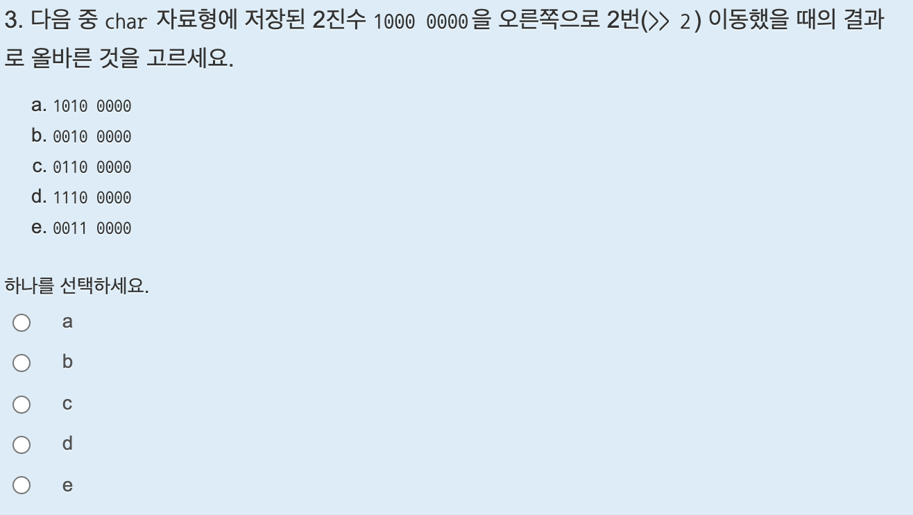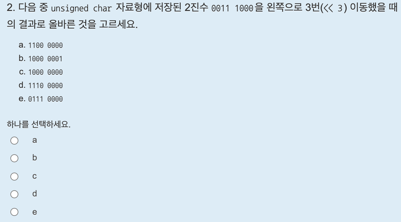i 변수는 8비트 이므로 i는 1에서 1칸씩 계속 왼쪽으로 시프트하다보면 1000 0000은 128 이고, 0000 0000이 되므로 i는 0일때 반복문을 종료시키면 된다. 답은 i != 0 이다.