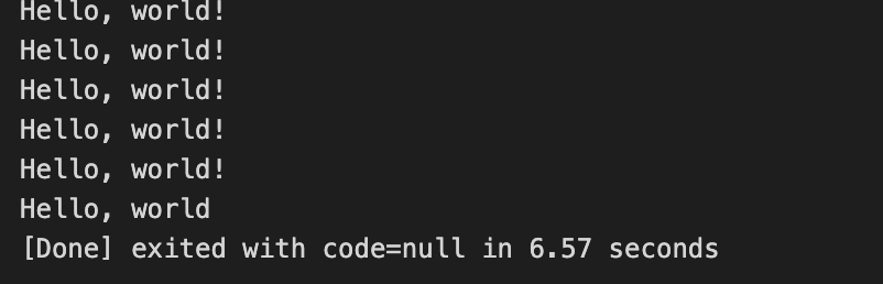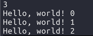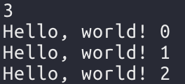 입력값을 받아서 count에 저장하고, i가 count보다 작을때까지 반복했다. 3을 입력했으므로 Hello world!는 3번 출력된다.