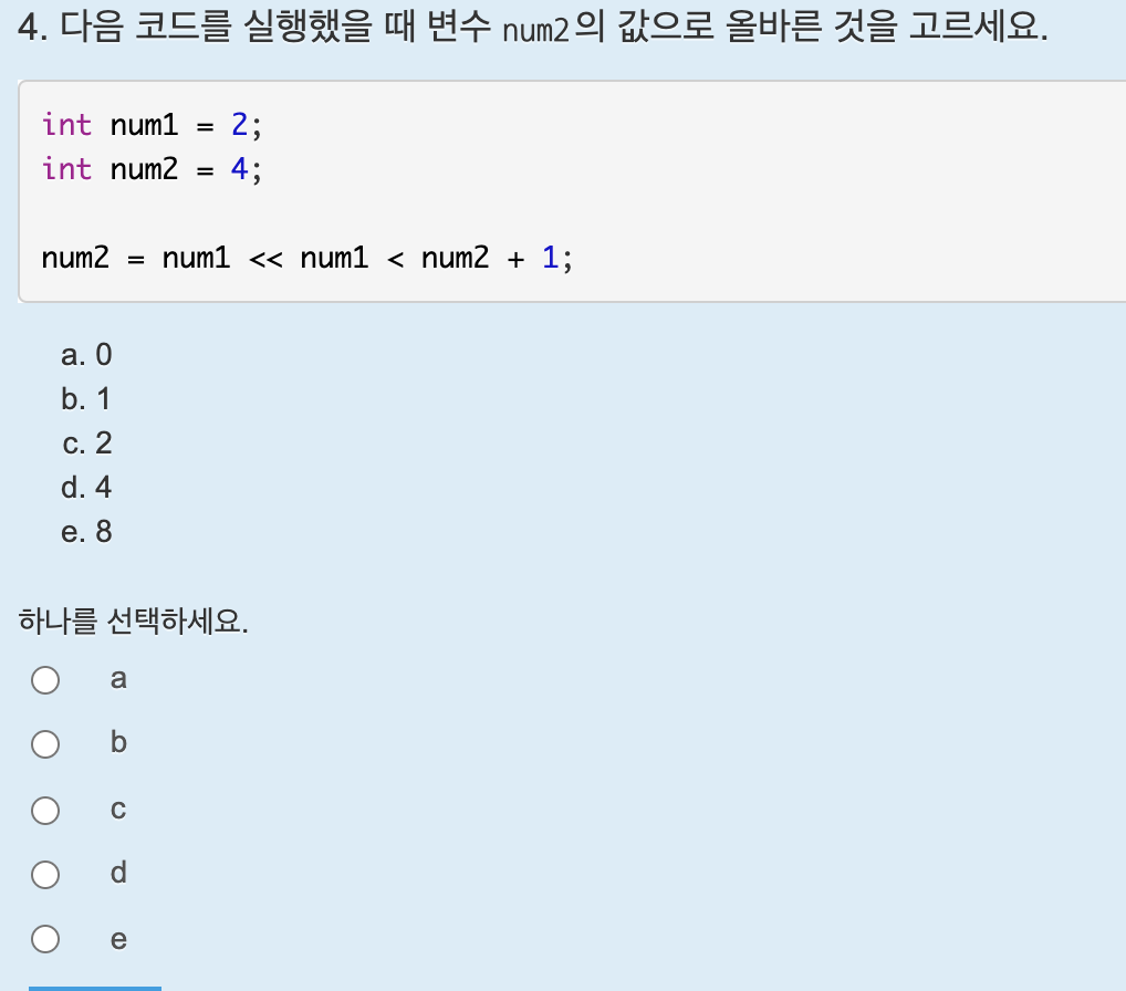 num4 <<= 2; // 비트를 왼쪽으로 2번 이동한 후 할당