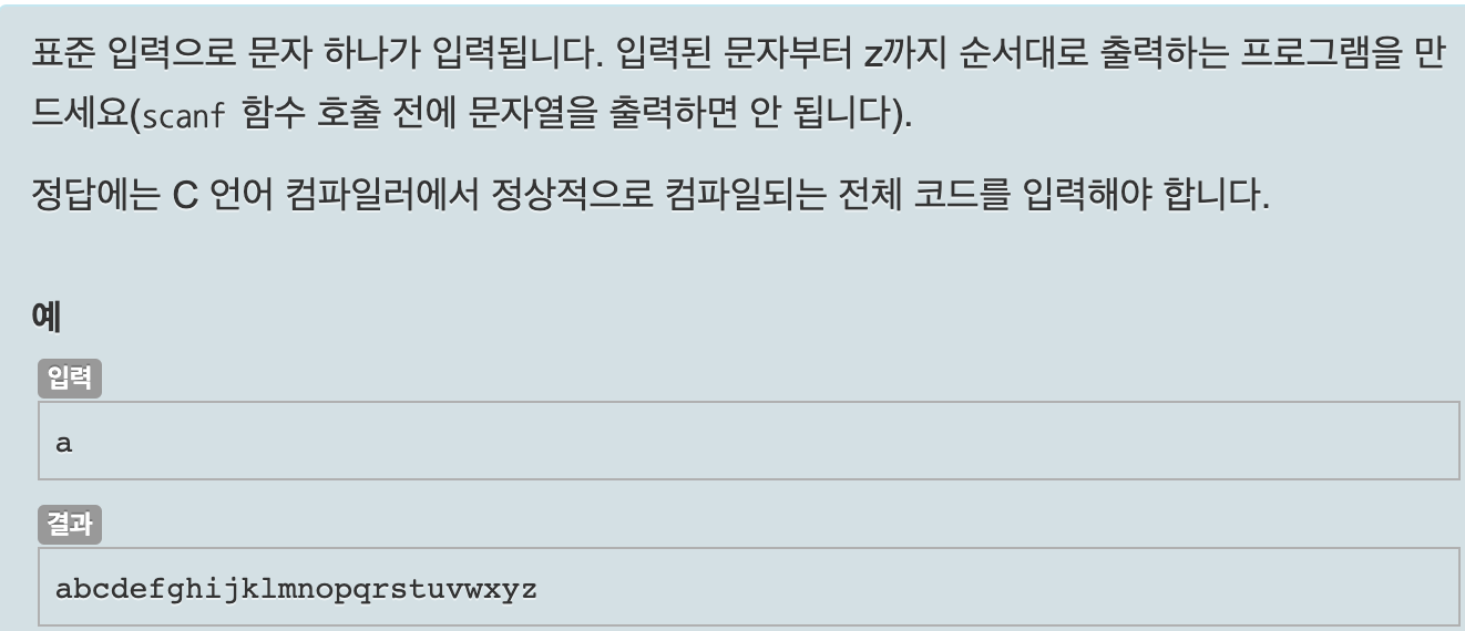 z는 아스키코드로 122이므로 i가 122가 될때까지 1씩 더하며 반복하며 i 값을 문자로 출력하였다.