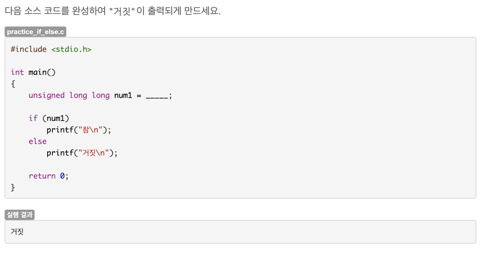 C에서는 0을 거짓으로, 0이 아닌 숫자를 참으로 사용하지만 stdbool.h 헤더를 사용하여 true를 참으로, false를 거짓으로 나타낼 수 있다.